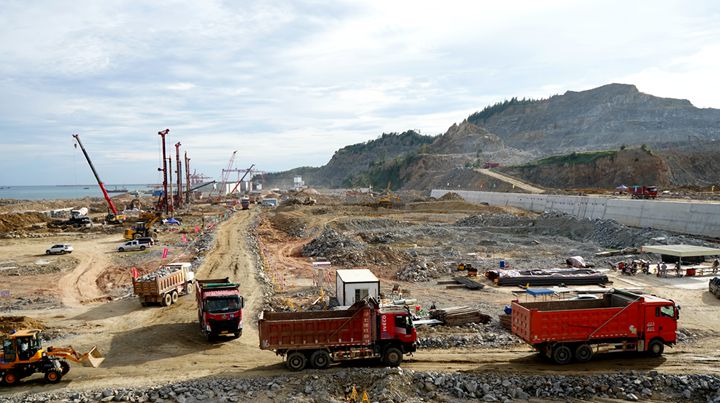 博賀新港區(qū)建設(shè)現(xiàn)場(chǎng)往來(lái)工程車(chē)輛川流不息,工地人員各司其職,各項(xiàng)工序有條不紊,處處展現(xiàn)出一派熱火朝天的建設(shè)景象。