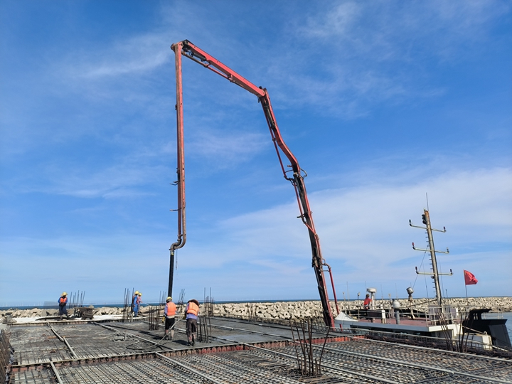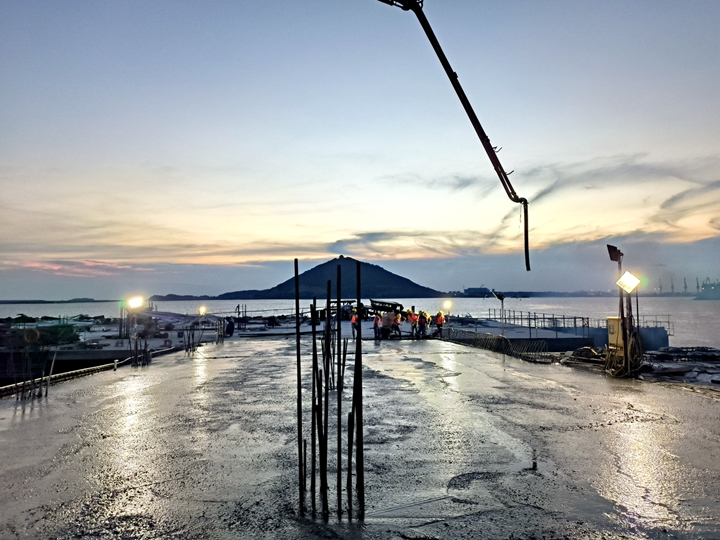 ▲油品碼頭工程水域公用管廊棧橋面層澆筑施工 油品碼頭項目臨時黨支部深入貫徹習近平新時代中國特色社會主義思想,緊緊圍繞茂名港集團黨委“項目為王”工作部署,以茂名港口岸開放時間節(jié)點為目標,加強基層黨組織的建設,把支部建設在工程一線上,充分發(fā)揮黨支部的戰(zhàn)斗堡壘作用,積極肩負建設單位組織、溝通、協(xié)調(diào)的主體責任,切實做到責任不“臨時”。通過統(tǒng)籌設計、監(jiān)理及施工單位的技術(shù)人員力量,成立技術(shù)攻關(guān)小組、黨員示范崗,帶頭展開“立項式”攻關(guān)。經(jīng)過精心組織,科學施工,不斷優(yōu)化方案,加強工序銜接,合理調(diào)配資源,克服疫情影響、海上風浪大、作業(yè)面交叉施工、施工難度大等難點,做到了工程安全有保障、工程質(zhì)量穩(wěn)定可控、工程進度有序推進。