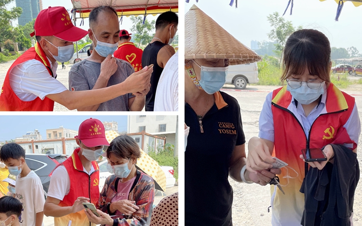 “請各位小朋友和老人家戴好口罩,也請各位家長到這邊掃碼,提前準(zhǔn)備好他們的核酸碼,前往那邊排隊(duì),間隔一米距離!秉h員志愿者在協(xié)助做好核酸檢測工作的同時,擔(dān)負(fù)起核酸檢測秩序維護(hù)、安全注意事項(xiàng)提醒的職責(zé)。 核酸檢測的現(xiàn)場有獨(dú)自前來的老人家,他們有的不知道如何使用手中的智能手機(jī),有的只有一部舊式按鍵手機(jī)。集團(tuán)黨員志愿者們耐心地幫他們錄入個人信息,成功進(jìn)行核酸檢測。為照顧本地群眾的語言習(xí)慣,集團(tuán)志愿者還貼心地用粵語、普通話還有“夾生”黎話(當(dāng)?shù)胤窖裕┹喎M(jìn)行了“多語種”宣導(dǎo)。集團(tuán)黨員志愿者熱情友好的志愿服務(wù)得到了現(xiàn)場群眾和其他志愿者的一致好評!