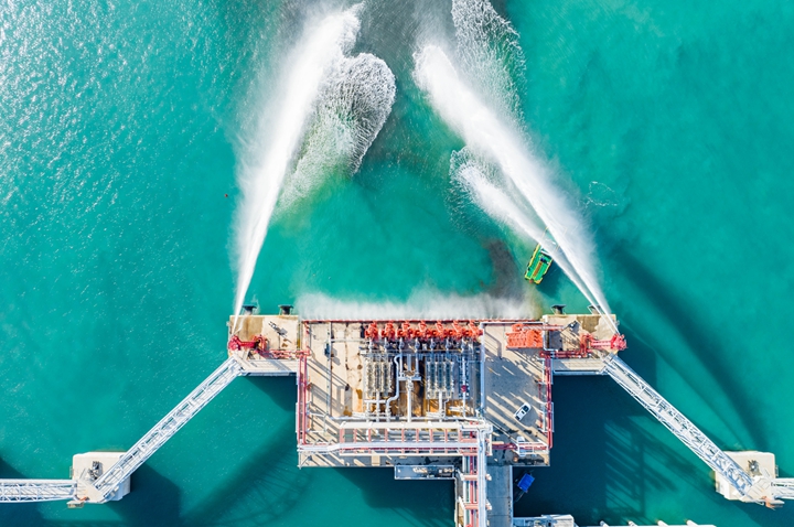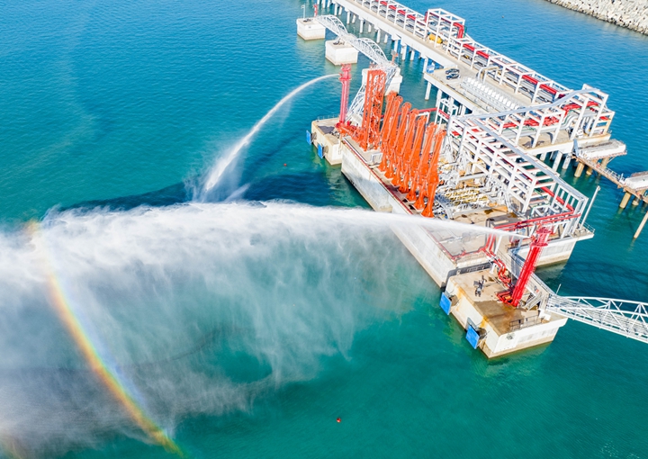 2023年12月7日下午,隨著公用工作樓首層消防泵房的紅色“巨獸”傳出一聲噪響,矗立10萬噸級成品油泊位兩側(cè)靠船平臺上的消防炮塔噴射出兩道水柱,標(biāo)志著茂名港博賀新港區(qū)東區(qū)10萬噸級成品油碼頭項目大型消防泵組和消防炮塔聯(lián)合運行成功,為項目即將轉(zhuǎn)入運營提供消防安全保障。